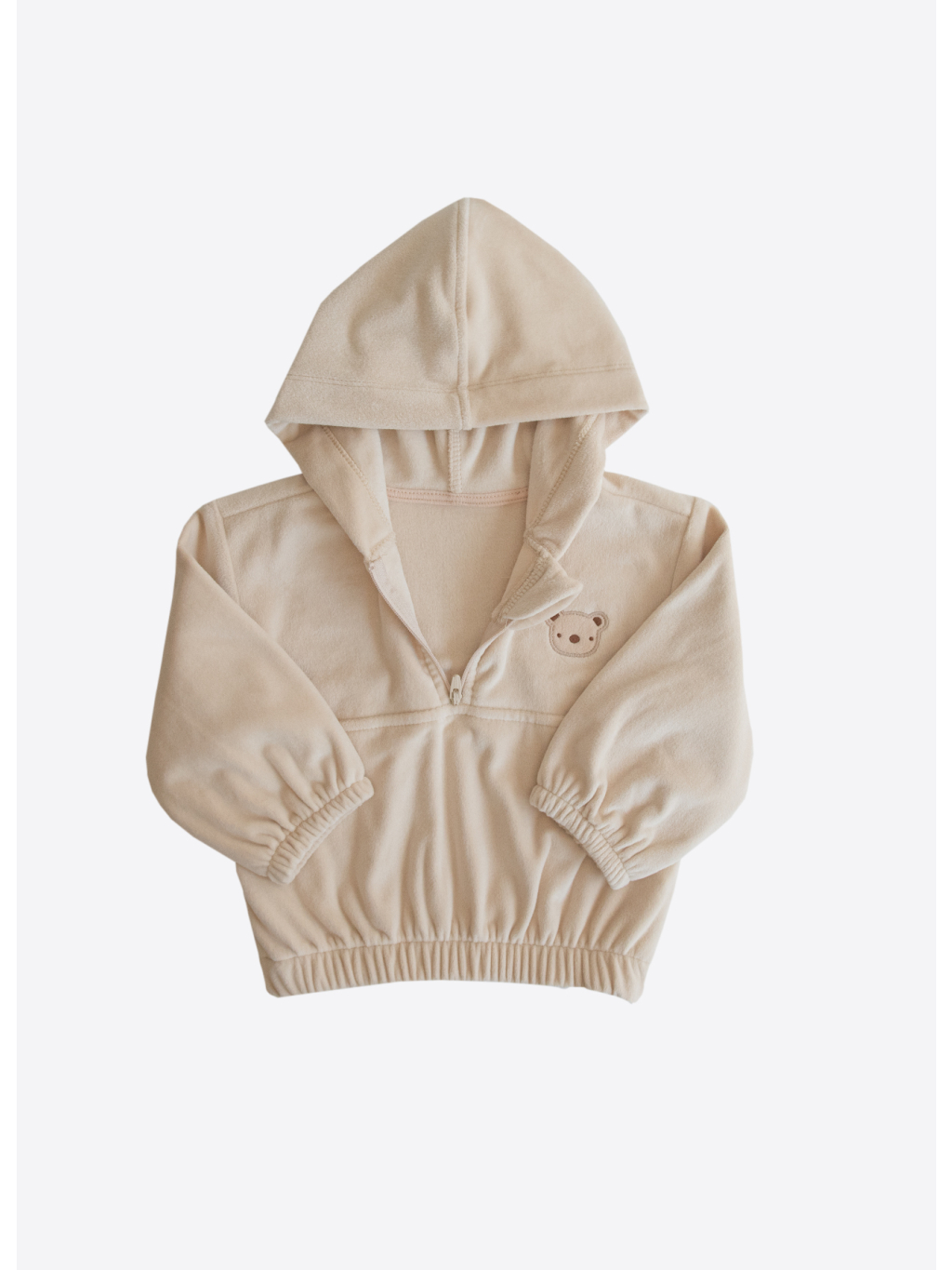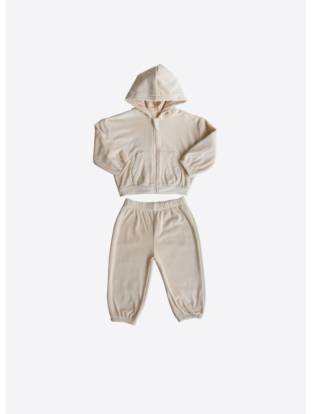 Sada obsahuje mikinu s dlouhým rukávem a kalhoty, obě z měkkého sametu (kadife) s jemným jednobarevným designem a příjemným materiálem šetrným k dětské pokožce.
