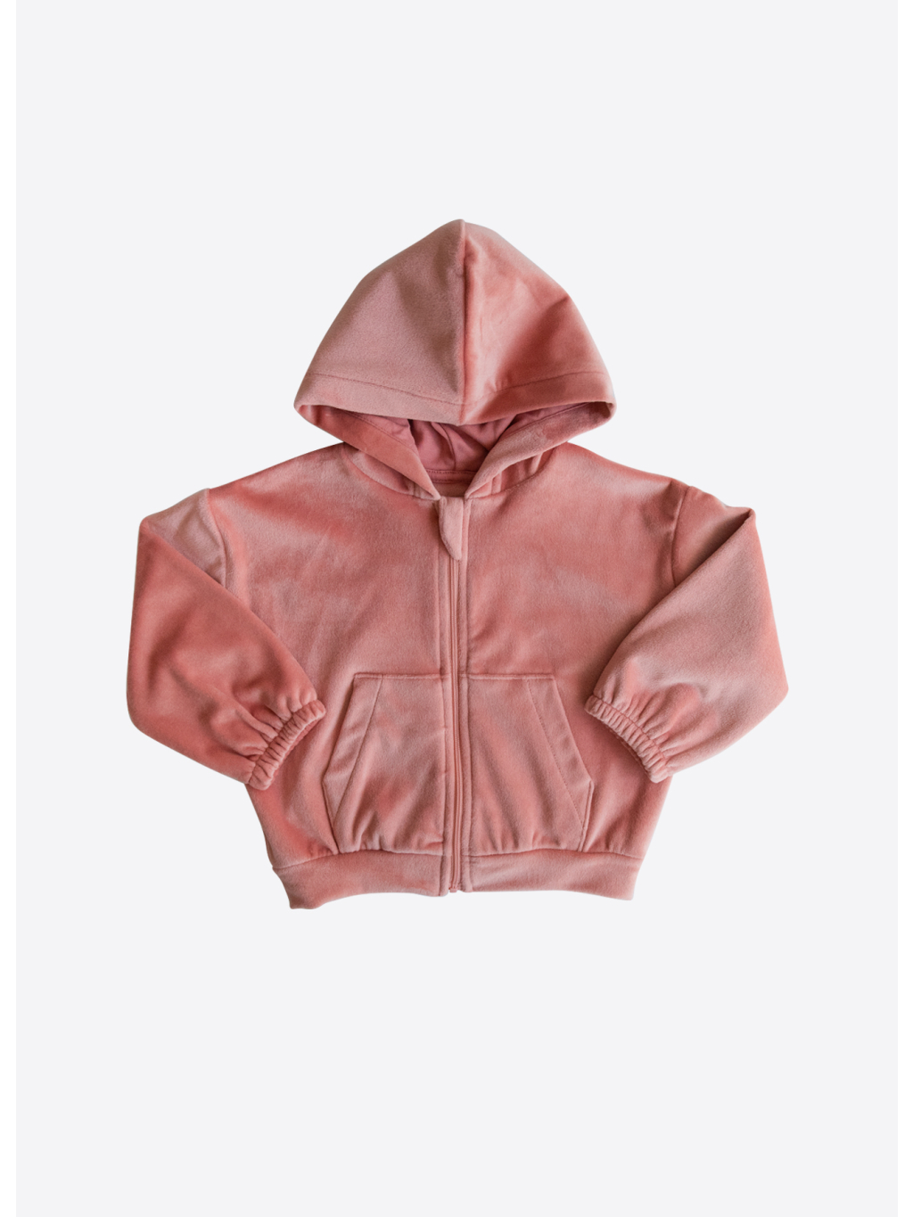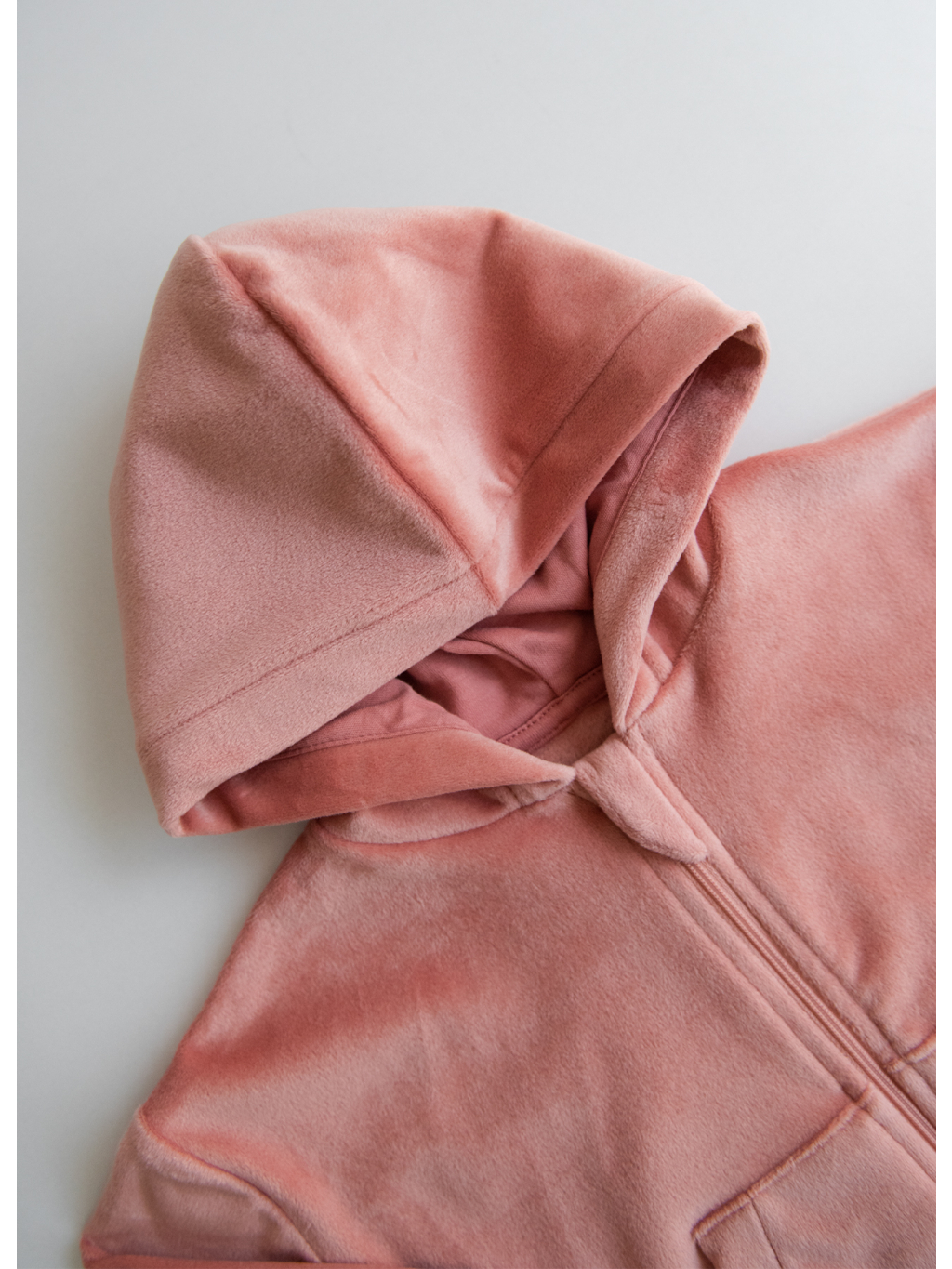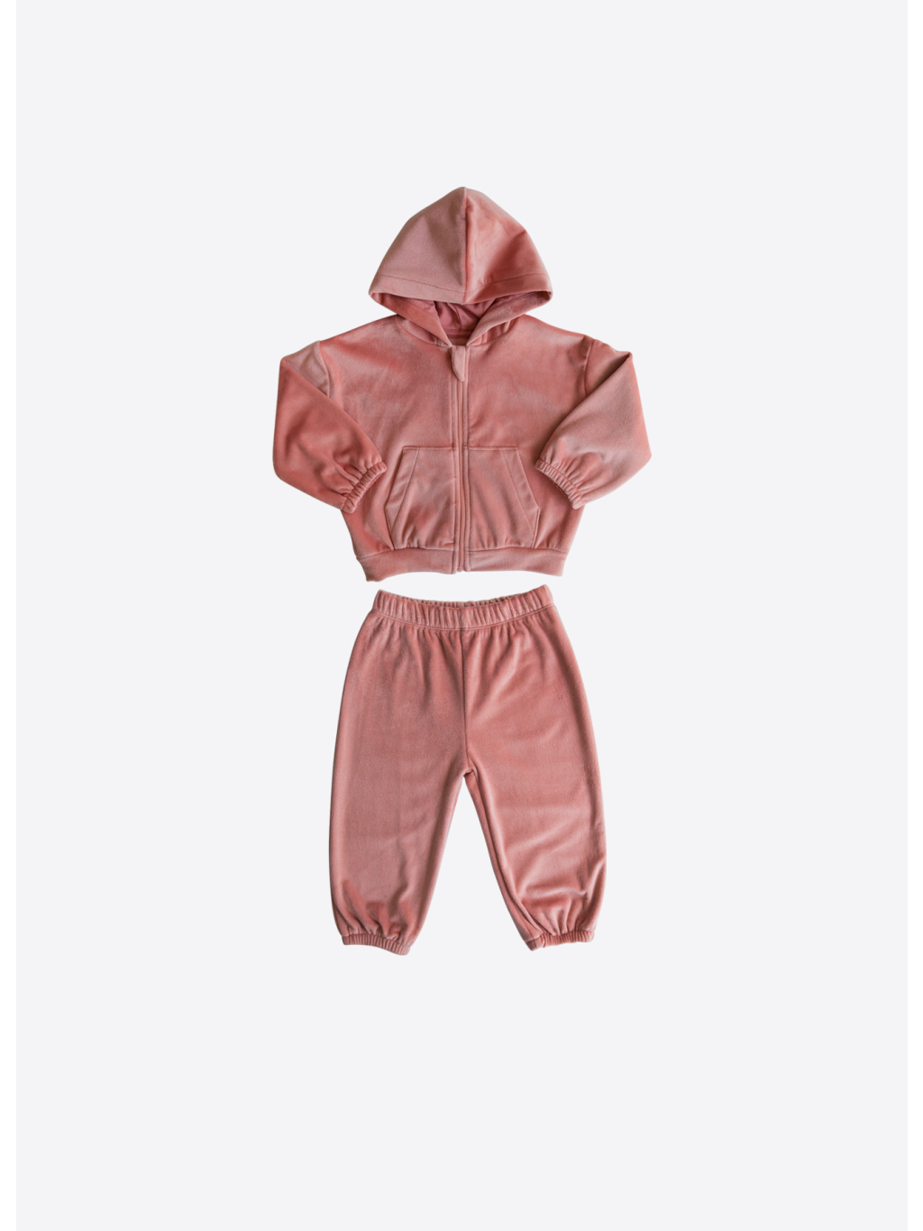 Sada obsahuje mikinu s dlouhým rukávem a kalhoty, obě z měkkého sametu (kadife) s jemným jednobarevným designem a příjemným materiálem šetrným k dětské pokožce.