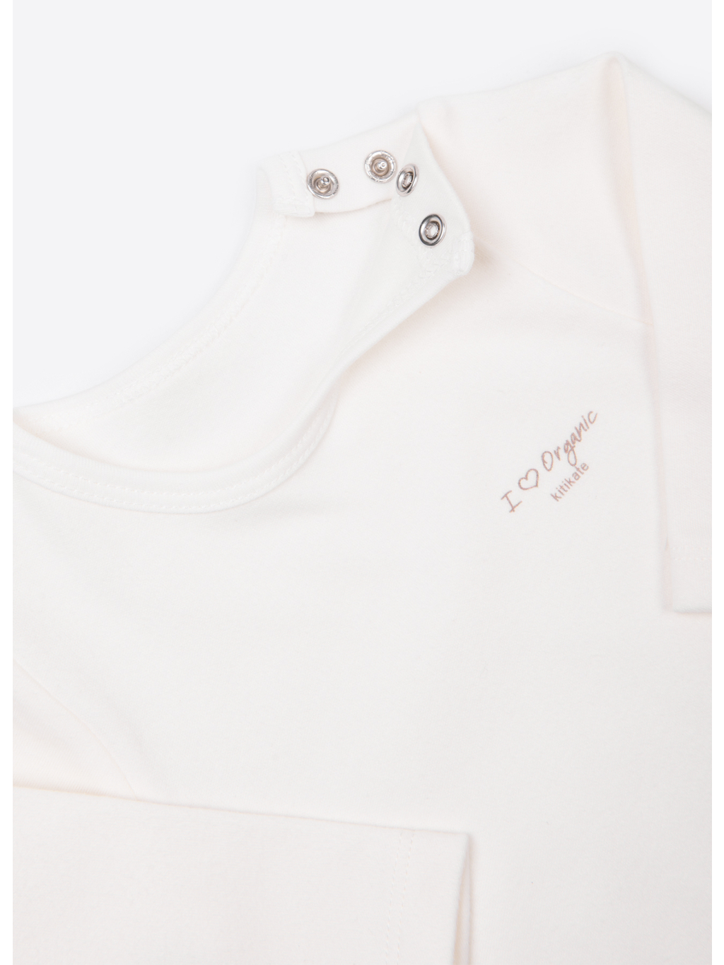This unicolor American-style long-sleeved cotton body was designed by Kitikate to suit both little girls and boys at the age of 1-12 months. The body comes in several variations, in pink, blue, cream, or ecru color. There's also the tiny writing "I love Organic" written in Italics. The body fastens with two poppers on one shoulder and three poppers between the legs.