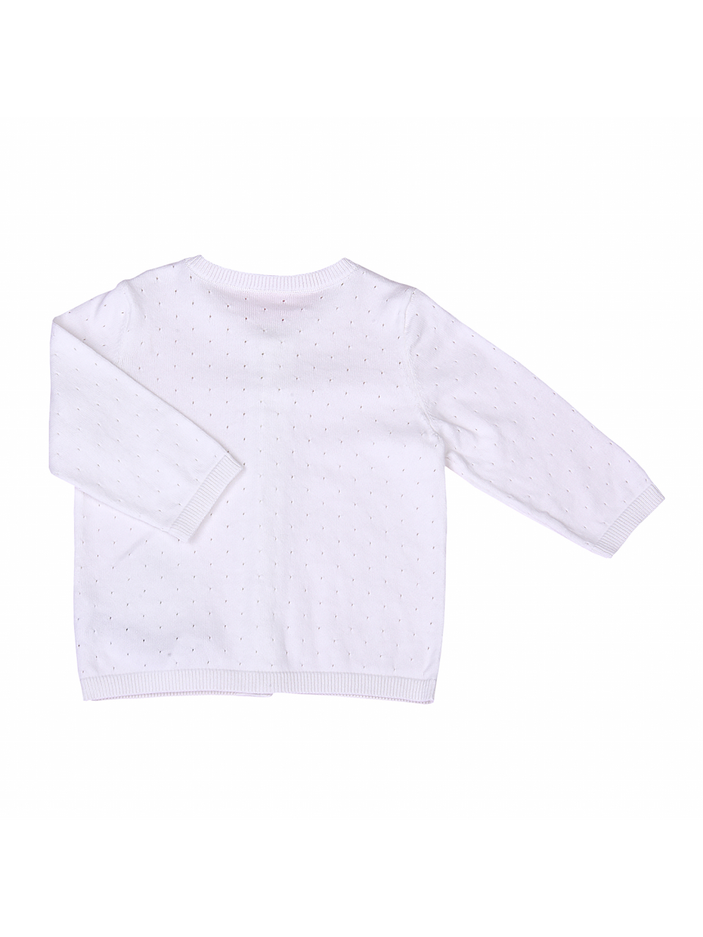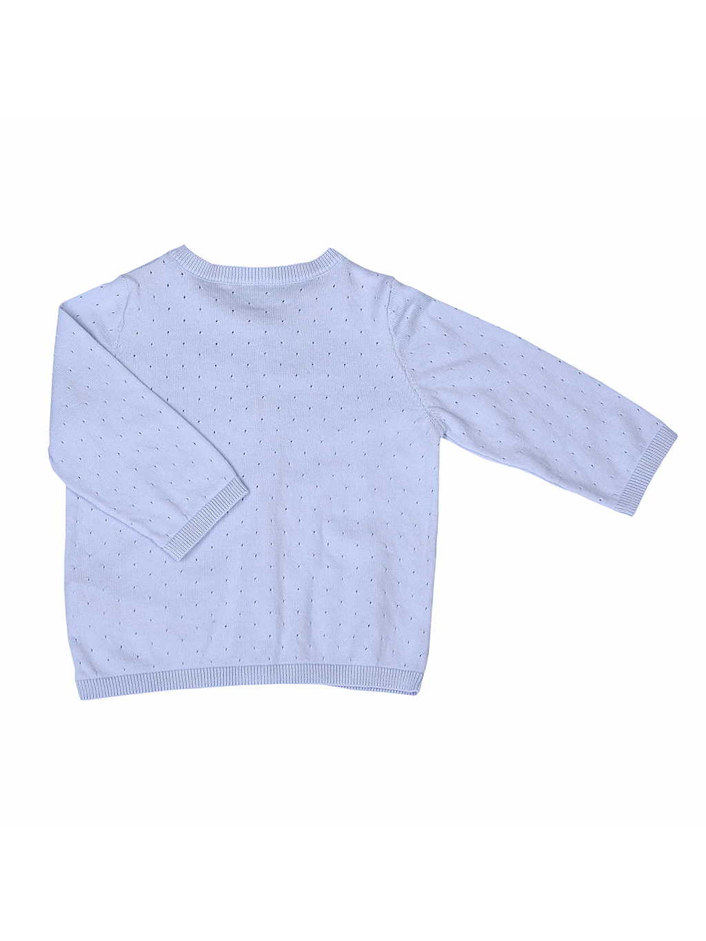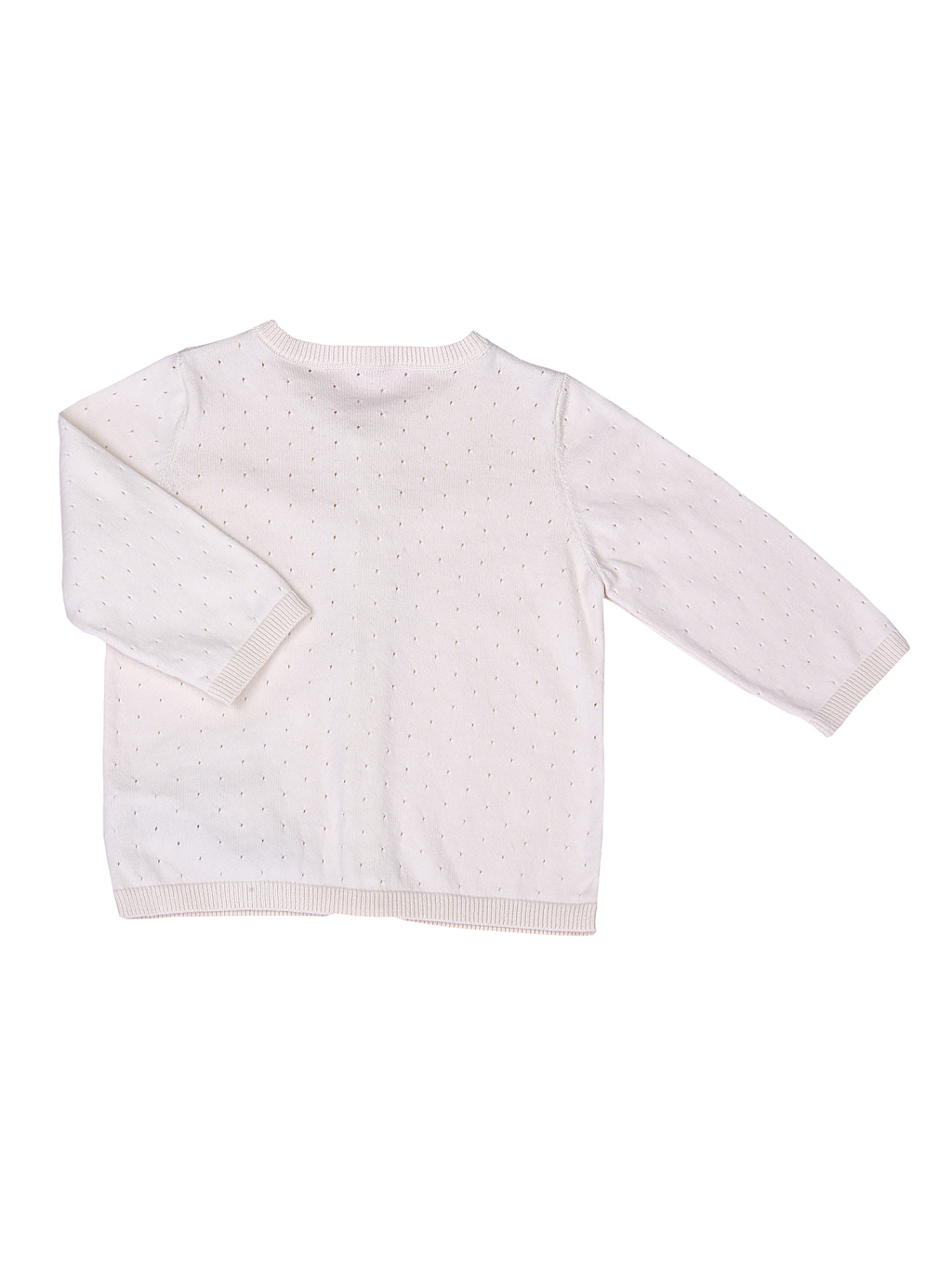 Tenký svetřík s dírkovým vzorečkem se vyrábí ve smetanové, krémové, růžové a modré barvě.