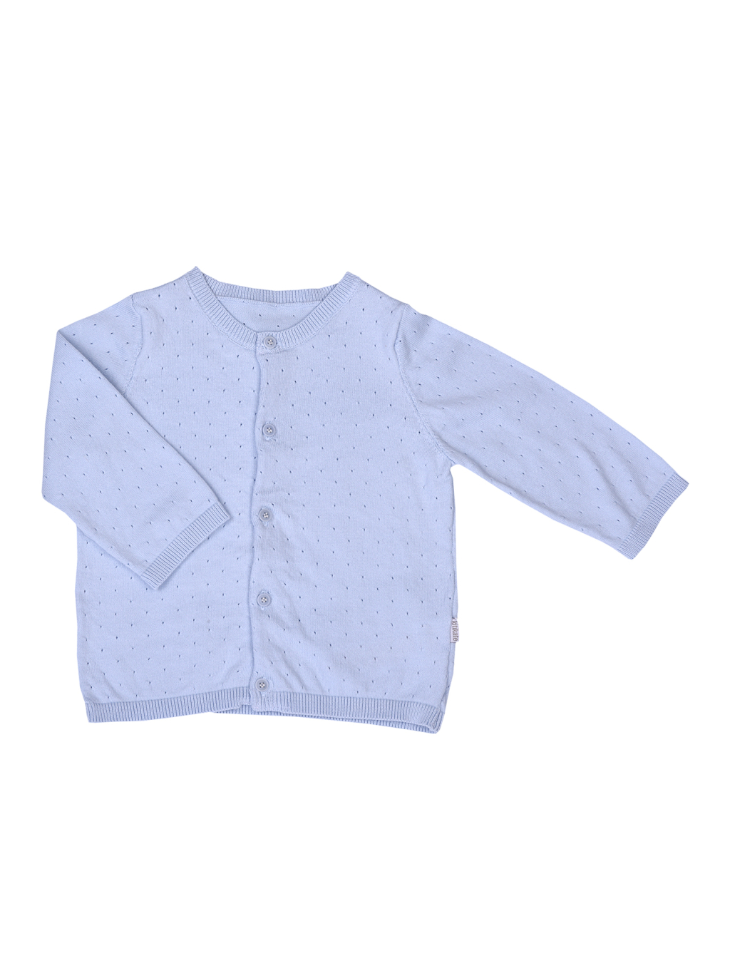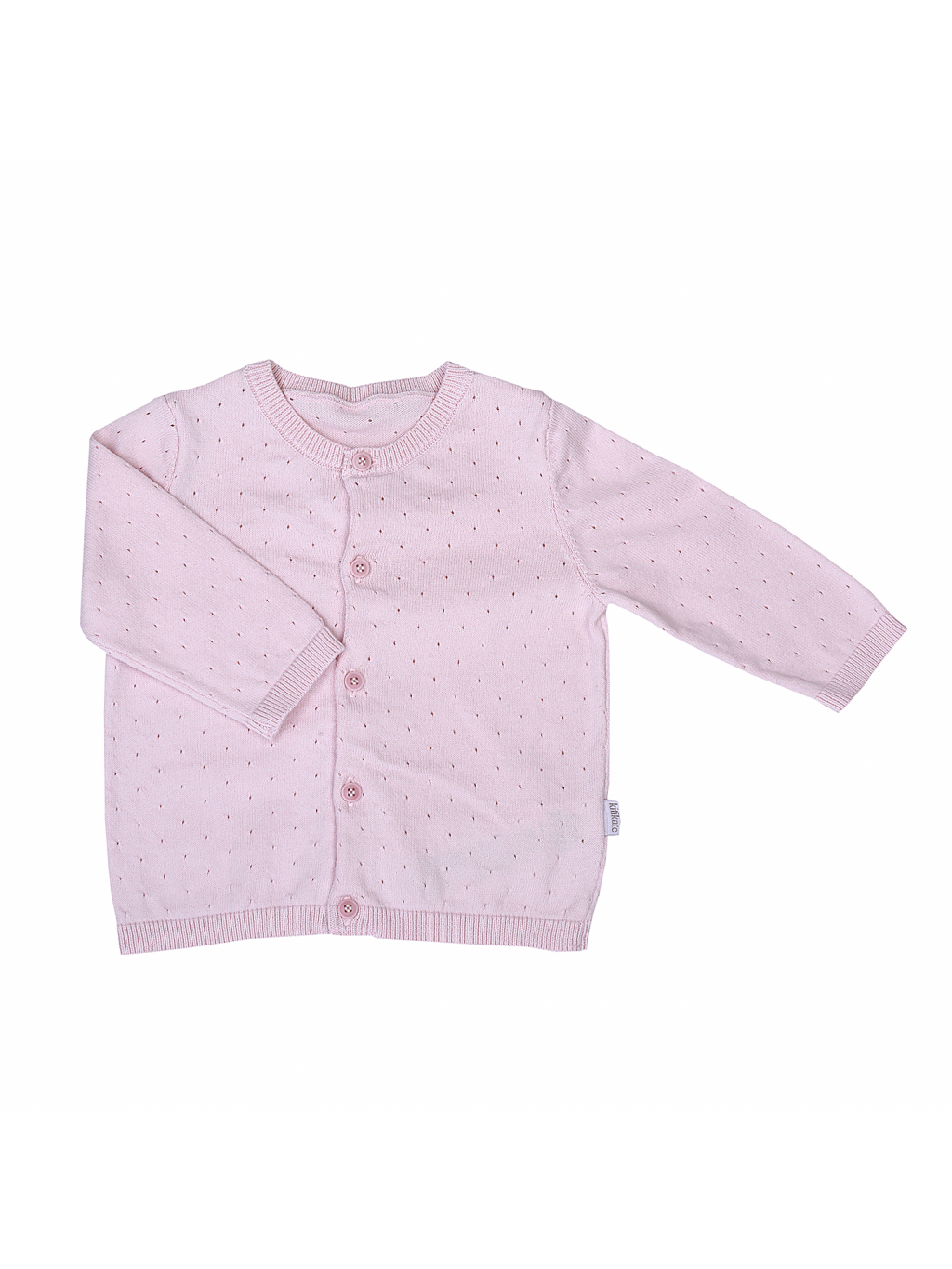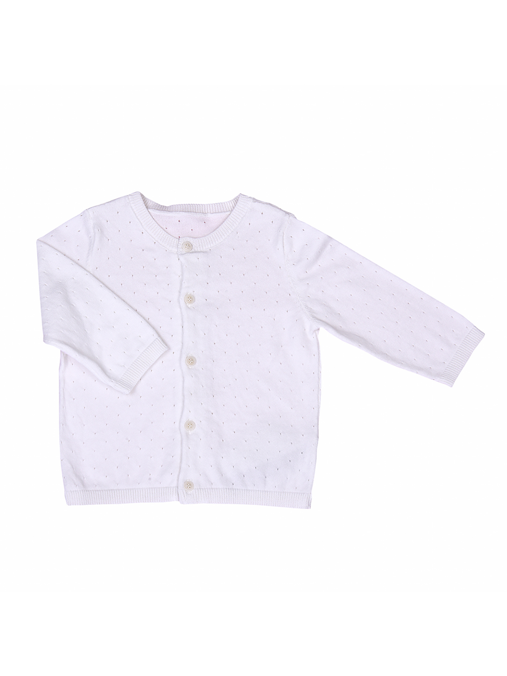 Tenký svetřík s dírkovým vzorečkem se vyrábí ve smetanové, krémové, růžové a modré barvě.