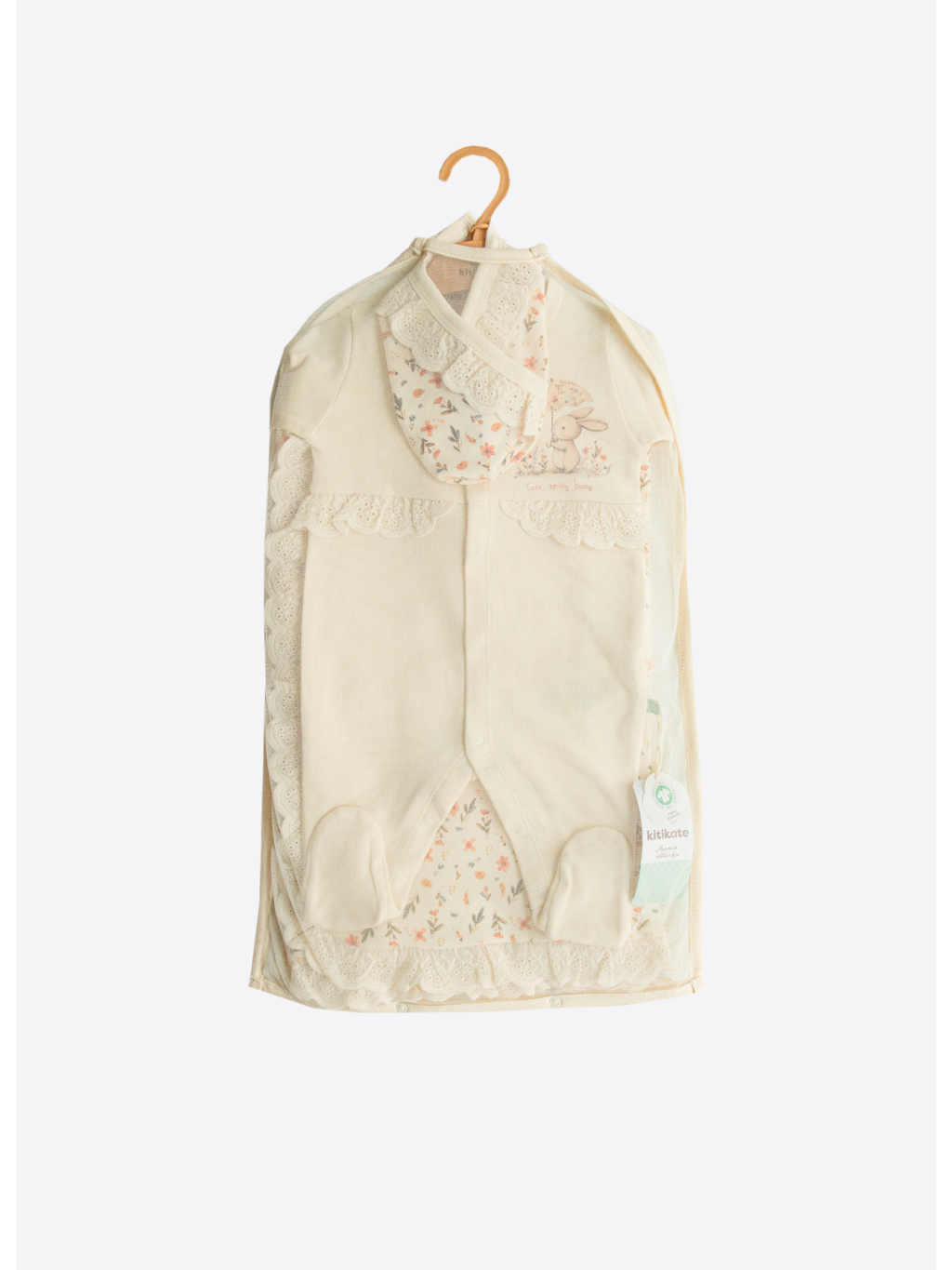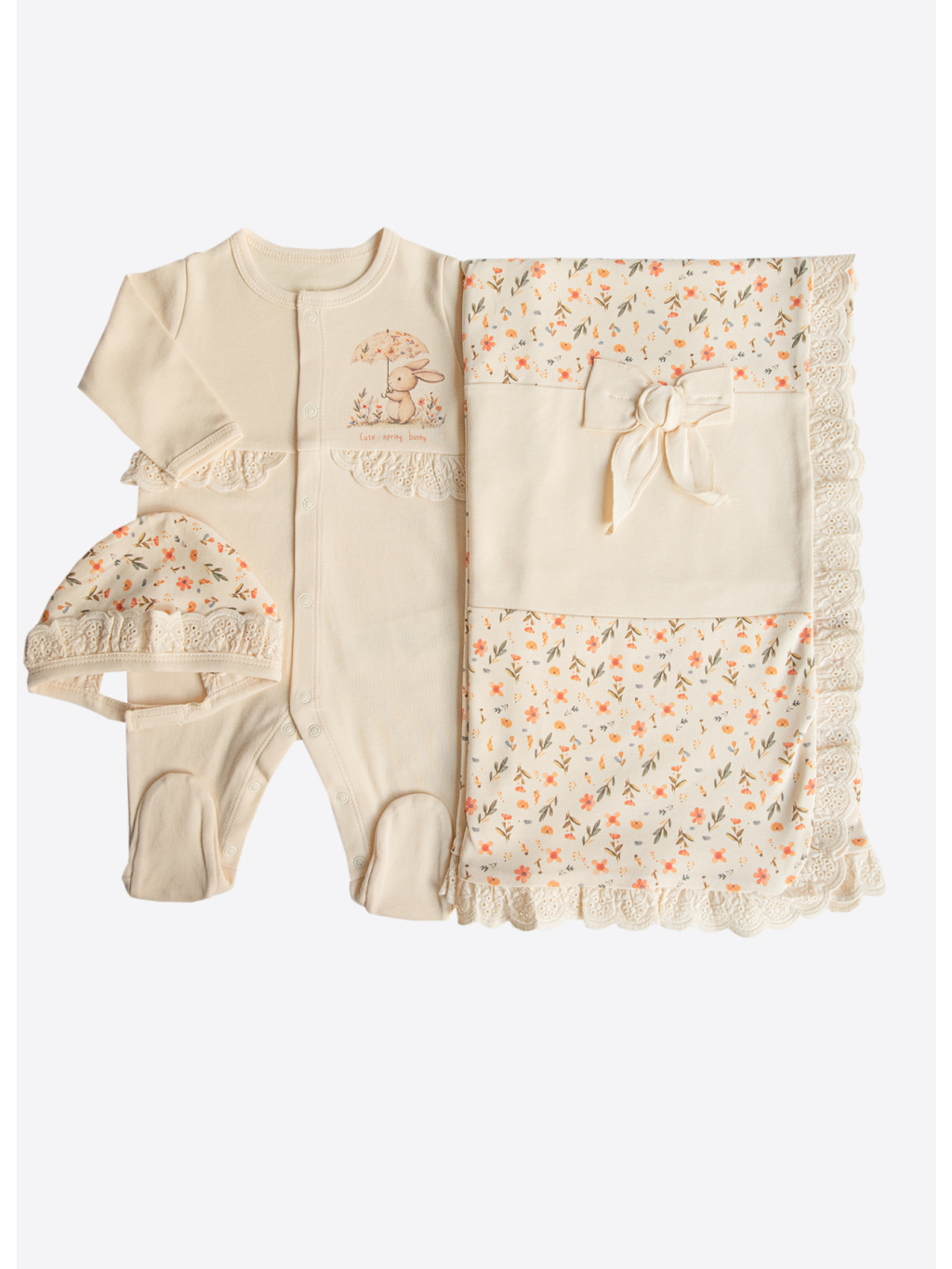 Kojenecký set overal, deka, čepička, vak a motivem králíčka.