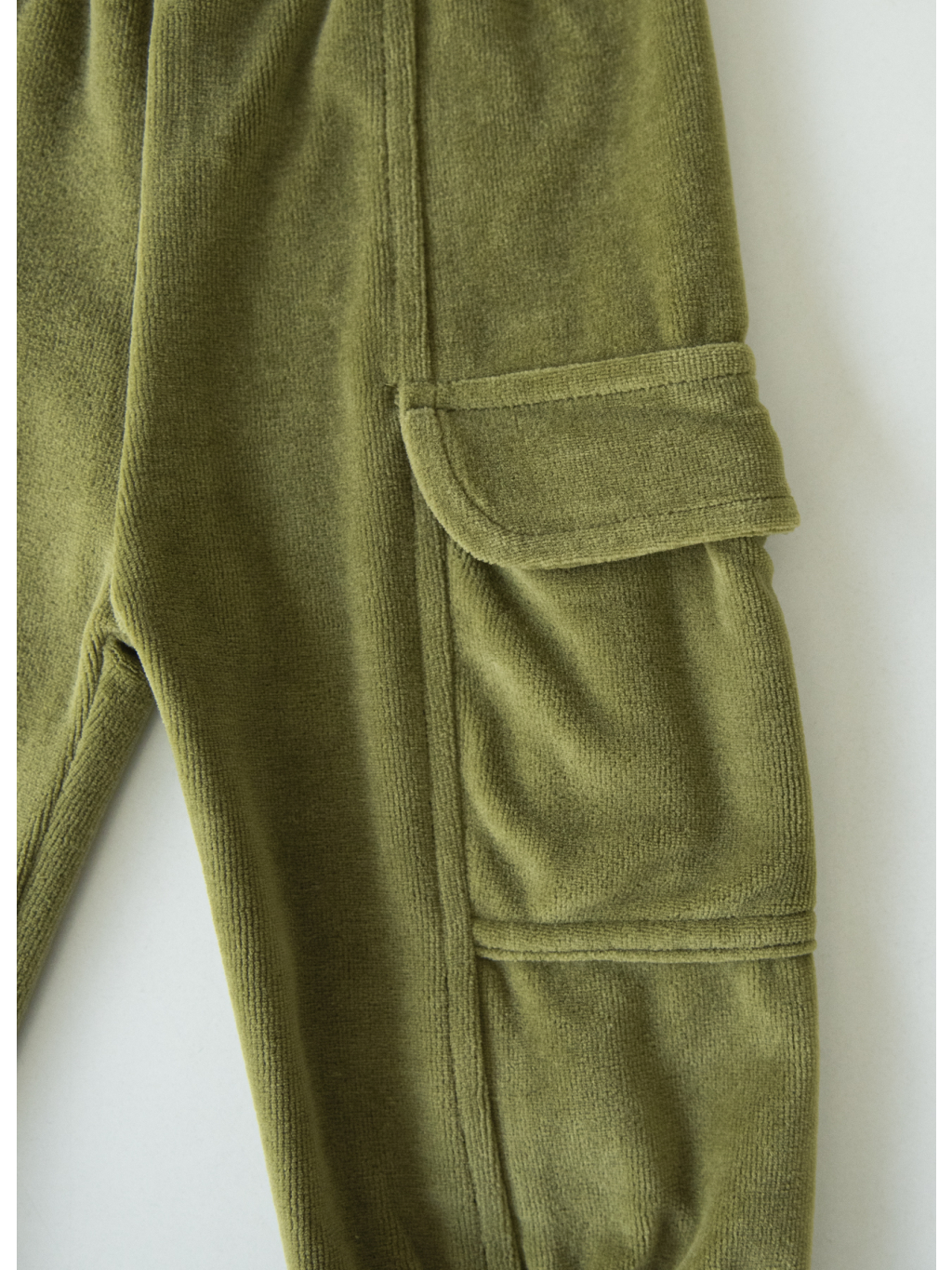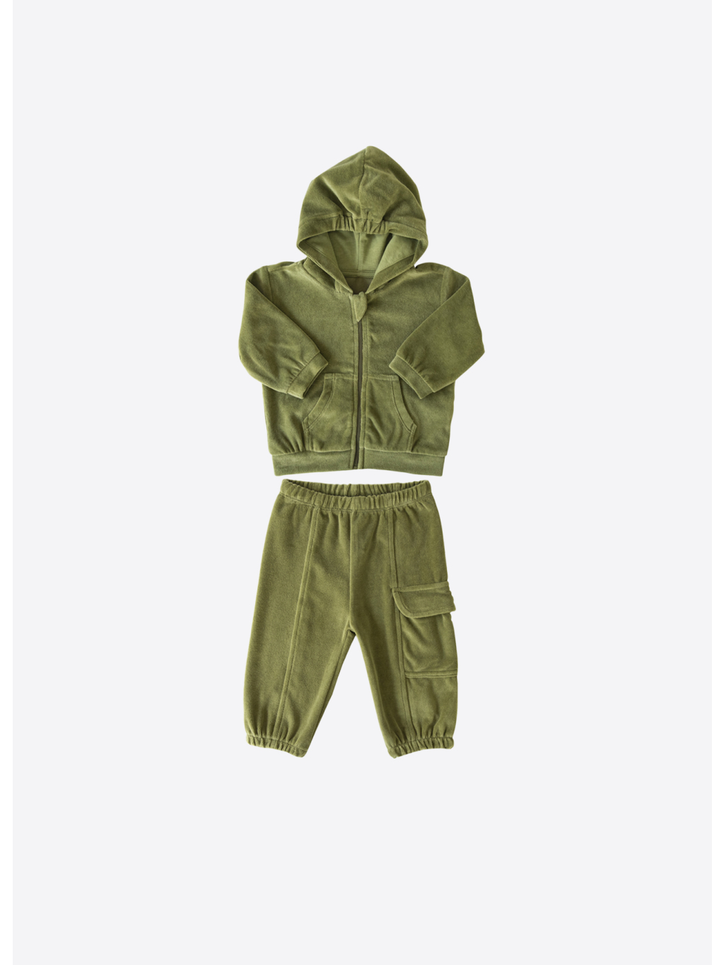 Sada obsahuje mikinu s dlouhým rukávem a kalhoty, obě z měkkého sametu (kadife) s jemným jednobarevným designem a příjemným materiálem šetrným k dětské pokožce.