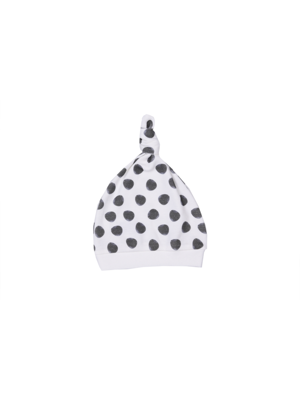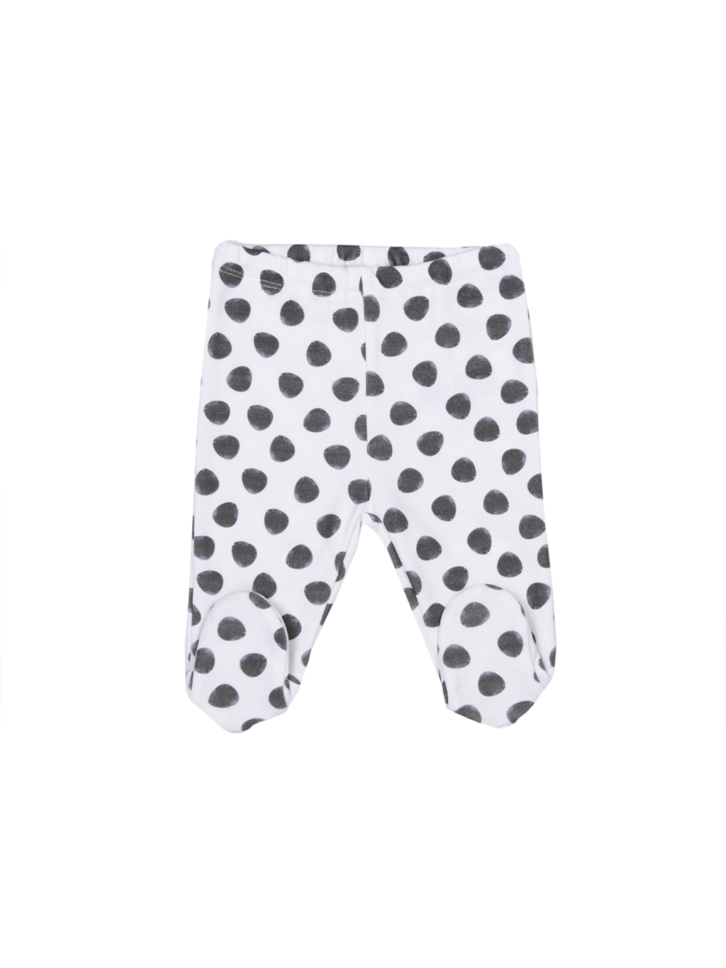 Soupravička má podklad ve smetanové barvě, na kabátku je obrázek pandy, na bryndáčku nápis a kalhoty a čepička jsou potištěny velkými černými puntíky.