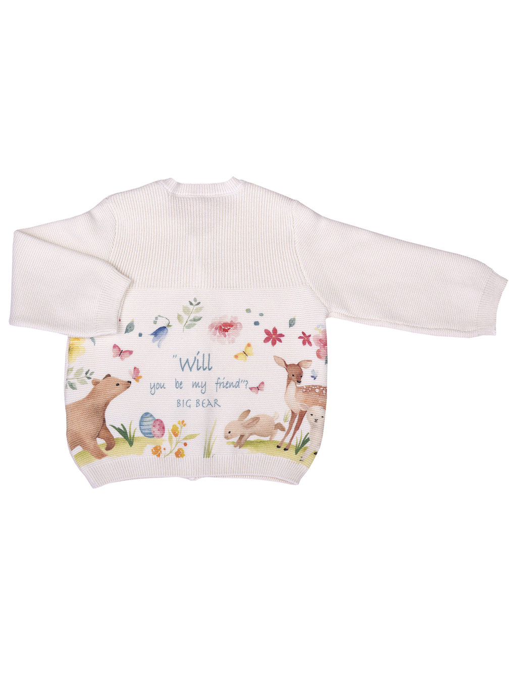 Na svetříku jsou použity 2 různé vzorečky a navíc je na zádech zdobený obrázkem lesních zvířátek.